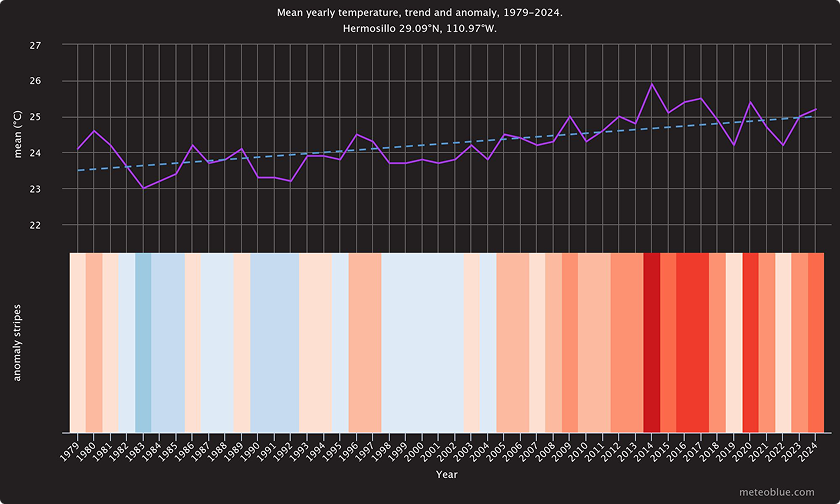 Desde 1950 hasta 2023, Hermosillo ha mostrado un aumento constante en su temperatura media anual, pasando de valores cercanos a los 24 °C en los años 50 a más de 27 °C en años recientes.